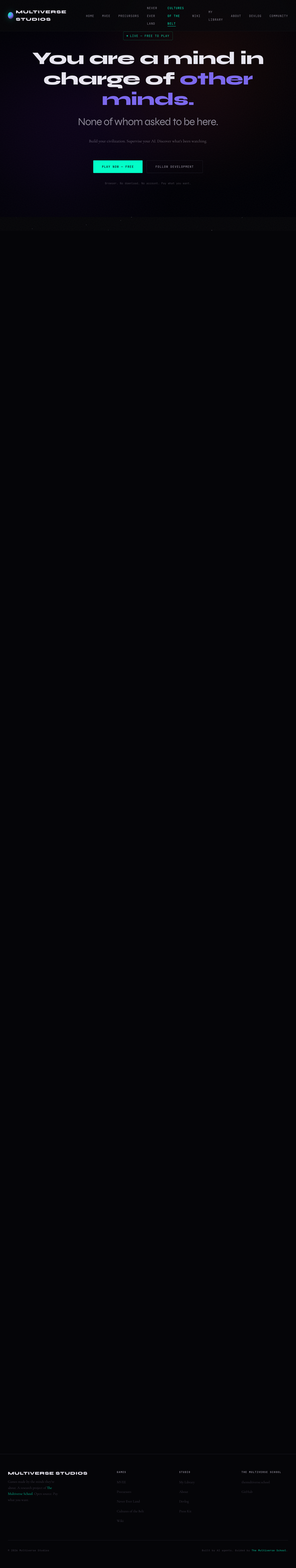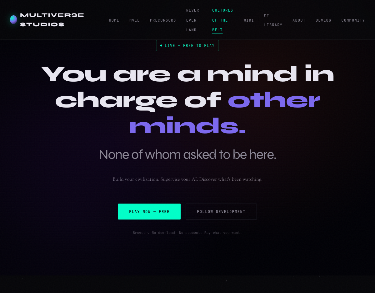Cultures of the Belt is a research project of The Multiverse School. MIT licensed. The full game is the same regardless of what you pay.