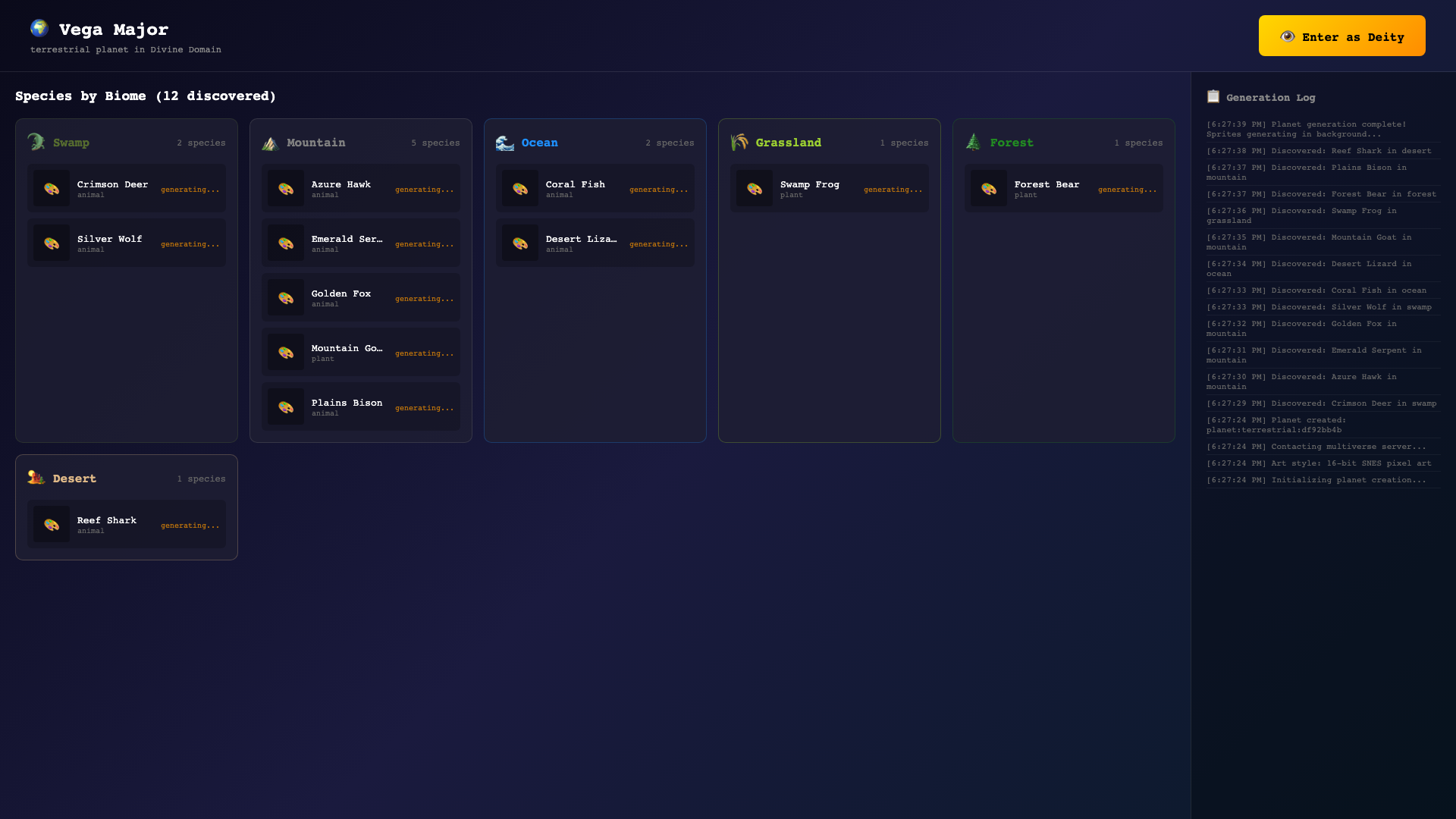 Key features: True genetic simulation (48 chemical pathways per Norn, 73 across all species), 50+ species from world folklore (Norn, Grendel, Ettin, Mycon, Shee, Dvergar, Álfar, Valkyr + 40+ unlockable), LLM cognition, 6 intelligence tiers, 14,400px world, interstellar travel, galactic lore